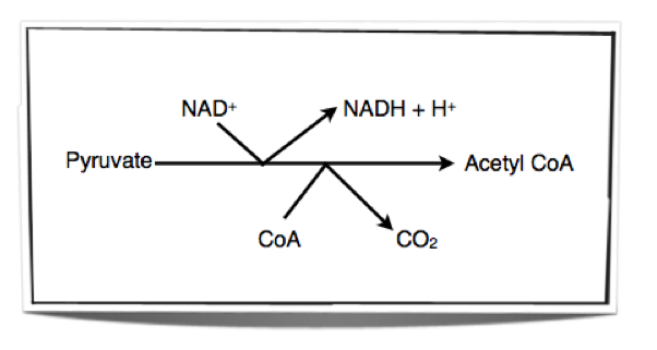 Mitochondria in cells take up the pyruvate which is formed from glycolysis in the cytoplasm. Once the pyruvate is in the mitochondrion, enzymes within the matrix of the mitochondrion remove hydrogen and carbon dioxide from the pyruvate. This is called oxidation (removal of hydrogen or addition of oxygen) and decarboxylation (removal of carbon dioxide). Therefore, the process is called oxidative decarboxylation. The hydrogen removed is accepted by NAD+. The link reaction results in the formation of an acetyl group. This acetyl group is then accepted by CoA and forms acetyl CoA.