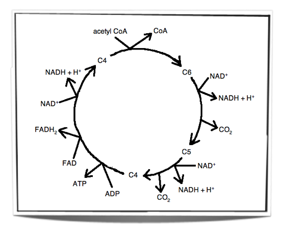 Step 4 - The four carbon compound then undergoes substrate-level phosphorylation and during this reaction it produces ATP. Oxidation also occurs twice (2 hydrogens are removed). The one hydrogen is accepted by NAD+ and forms NADH + H+. The other is accepted by FAD and forms FADH2. The four carbon compound is then ready to accept a new acetyl group and the cycle is repeated.