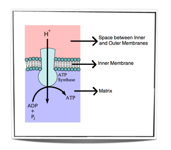 Figure 8.1.7 shows the movement of protons down their concentration gradient. They can only travel through the inner membrane via ATP synthase and as they do so they release energy. This energy is used by ATP synthase to convert ADP into ATP.
