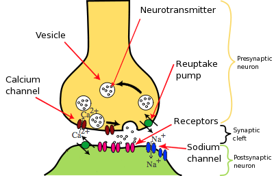 An action potential travels along the neuron and reaches the end of the pre-synaptic neuron. The depolarization of the pre-synaptic membrane results in the opening of voltage gated calcium channels. Calcium ions flow into the presynaptic neuron and cause vesicles with neurotransmitters inside the neuron to fuse with the plasma membrane and release the neurotransmitters into the synaptic cleft via exocytosis. These neurotransmitters then diffuse within the synaptic cleft and some will bind to specific receptors located on the postsynaptic plasma membrane. The receptors are transmitted-gated ion channels which open and let sodium and other positively charged ions into the postsynaptic neuron when the neurotransmitters bind. As these positively charged ions enter the postsynaptic neuron they cause its membrane to depolarize. This depolarization results in an action potential which passes down the postsynaptic neuron. The neurotransmitters in the synaptic cleft are then quickly degraded and the calcium ions are pumped back into the synaptic cleft from inside the presynaptic neuron.