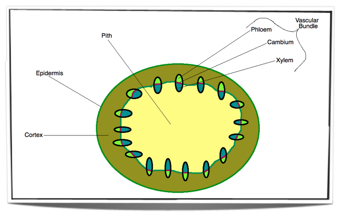 9.1.1 Draw and label plan diagrams to show the distribution of tissues in the stem and leaf of a dicotyledonous plant.