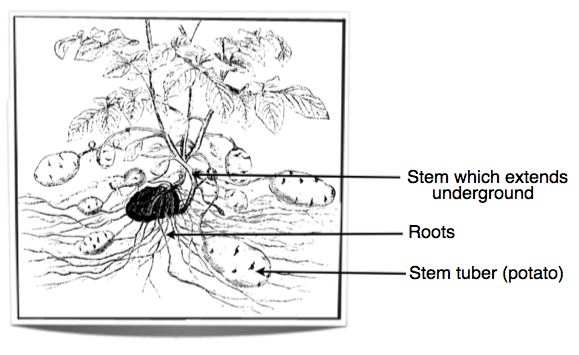 Stem Tubers: These are modified stems which serve as food storage. The stem extends into the ground and forms enlarged, swollen structures which we call stem tubers. Stem tubers are used to store nutrients and therefore allow the plant to survive winter as well as other adverse conditions. They also serve as a mean of asexual reproduction as new plants develop from these stem tubers. An example of a stem tuber is a potato.