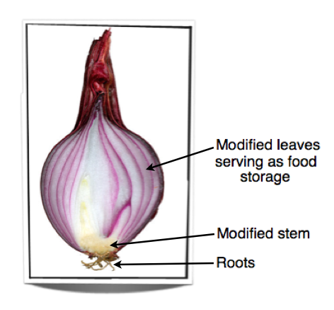 Bulbs: These are modified leaf bases which serve as food storage and thereby enable the plant to survive adverse conditions.These leaf bases may look like scales or they may extend over and encircle the centre of the bulb (onion). At the base of the bulb, a modified stem can be seen. Roots grow from the underside of the base while the new stems and leaves arise from the upper side of the base. An example of a bulb is an onion bulb.
