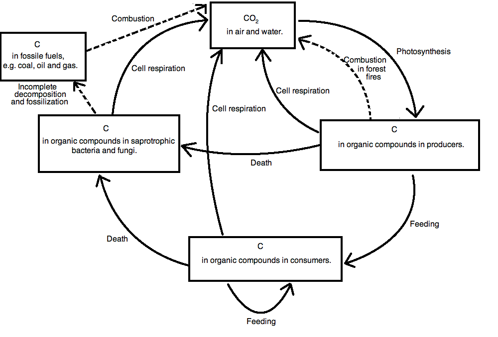 5.2.1 Draw and label a diagram of the carbon cycle to show the processes involved.