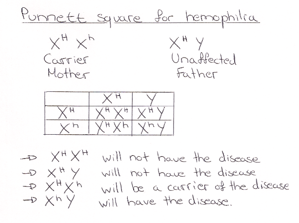 XH is the allele for normal blood clotting and is dominate over Xh which is recessive and causes hemophilia. If a mother is heterozygous she is a carrier of the disease but does not have hemophilia as the dominate allele is present. She can however pass the disease on to her offspring. Below is a punnett showing how a carrier mother and an unaffected father can pass the disease on to their offspring.