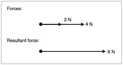 Sometimes we will have situations where two forces are acting in the same direction. In the situations we simply add together the magnitudes of both vectors. This is demonstrated in figure 1.3.2 below: